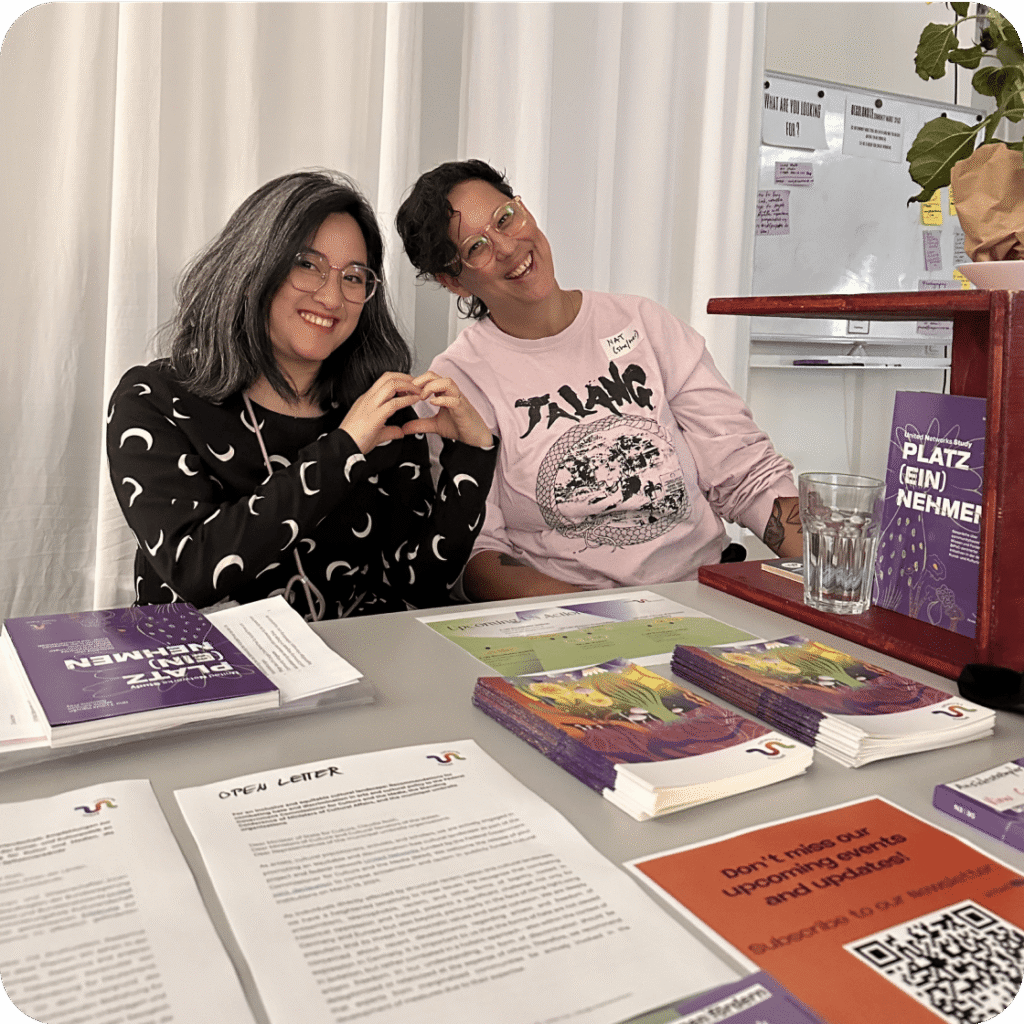 Unser Newsletter informiert, inspiriert und fördert den Dialog. Dabei stehen rassifizierte und marginalisierte (RuM) Stimmen im Mittelpunkt. Er hält die Abonnent*innen über die laufende Arbeit zu Interessenvertretung, (Ver-)Lernen und gemeinsamer Fürsorge in unserer Community auf dem Laufenden.